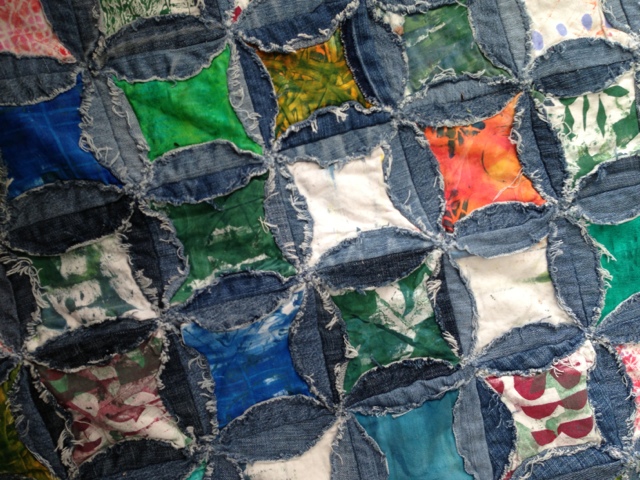 What to do when you have a pile of old jeans and hand printed fabrics and scraps of batting lying around? Cut them all up into squares and circles, lay them out in a pleasing pattern, sew the circles together, add a wavy line of quilting and then throw the completed rug in the washer and dryer to make it even more faded and ragged.